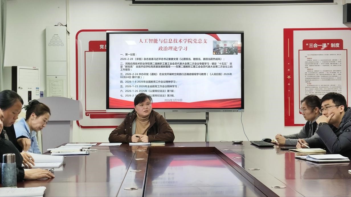 2026年3月10日,2026世界杯官方合作网站党总支组织郑州和开封校区全体党员及教职工,开展政治理论学习活动。本次学习活动由2026世界杯官方合作网站崔琳书记主持。主要学习内容有:1.第一议题:2026-2-28《求是》杂志发表习近平总书记重要文章《让愿担当、敢担当、善担当蔚然成风》;2.河南应用技术职业学院第二届教职工暨工会会员代表大会第二次会议专题学习:锚定“十五五”攻坚“新双高”全面开启学校高质量发展新篇章——在第二届教职工暨工会会员代表大会第二次会议上的工作报告;3.2026-2-24中办印发《通知》在全党开展树立和践行正确政绩观学习教育(《人民日报》2026年02月24日第01版);4.2026-1-8 2026年全国教育工作会议精神学习;5.2026-1-23 2026年全省教育工作会议精神学习;6.2026-1-26 2026年《以案释纪说法》第1辑;7.2026-2-10 2026年《以案释纪说法》第2辑。
